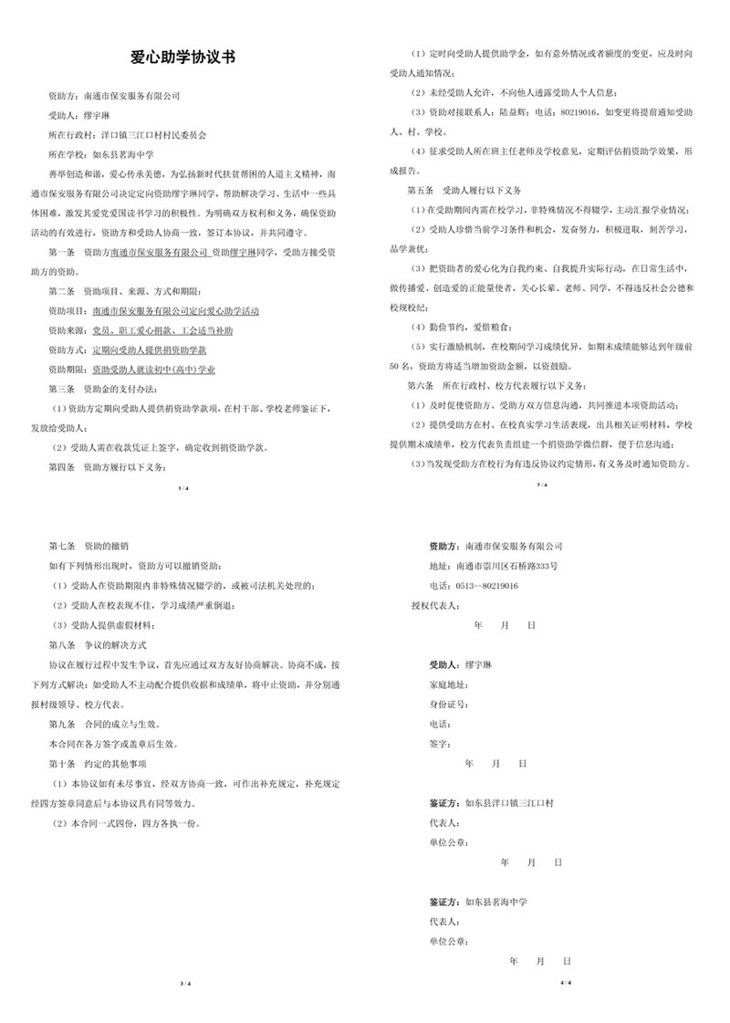 善舉創(chuàng)造和諧,愛心傳承美德。為弘揚(yáng)新時(shí)代扶貧幫困的人道主義精神,南通市保安服務(wù)有限公司發(fā)動(dòng)廣大黨員職工,定向資助如東縣茗海中學(xué)初三(9)班繆宇林同學(xué)。該同學(xué)母親離異,父親于今年1月因車禍搶救無(wú)效不幸生亡,奶奶肢體二級(jí)殘疾常年臥床不起,公司黨總支幫助她解決學(xué)習(xí)和生活中的困難。4月14日下午,公司黨總支副書記錢大年帶領(lǐng)相關(guān)部門負(fù)責(zé)人來(lái)到如東縣茗海中學(xué),舉行了捐資助學(xué)儀式,在副校長(zhǎng)周軍和洋口鎮(zhèn)三江口村黨總支書記張慧劍的見證下,將公司黨員職工的愛心捐款交到了繆宇琳同學(xué)手中,希望她珍惜當(dāng)前學(xué)習(xí)條件和機(jī)會(huì),發(fā)奮努力、刻苦學(xué)習(xí),做一個(gè)品學(xué)兼優(yōu)的好學(xué)生,公司將繼續(xù)資助其完成高中階段學(xué)業(yè)。