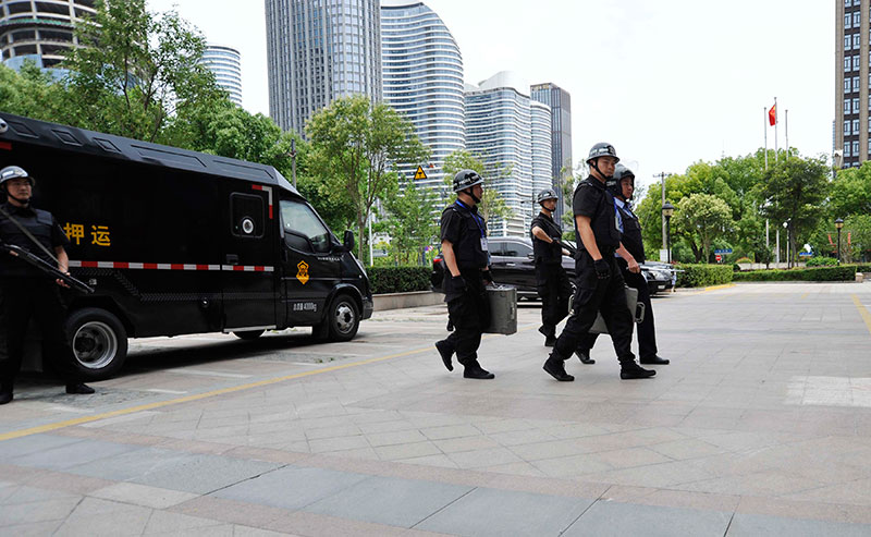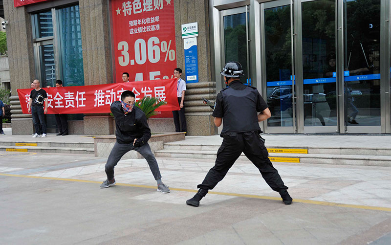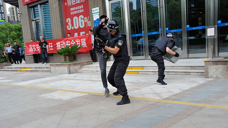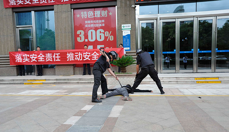 隨著演習(xí)總指揮方俊總經(jīng)理一聲令下,在江蘇銀行南通分行營業(yè)廳外,經(jīng)過偽裝的2名“歹徒”手持兇器實(shí)施暴力搶劫,此時(shí)危機(jī)四伏,情況緊急,只見武裝押運(yùn)人員沉著冷靜、快速反應(yīng),在突發(fā)的緊急危險(xiǎn)情況面前,充分運(yùn)用伸縮警棍和鋼叉與歹徒展開搏斗,最終將歹徒一一制服,確保了押運(yùn)任務(wù)的安全完成。演習(xí)過程中,押運(yùn)人員和營業(yè)廳工作人員分工明確,處置情況沉著冷靜,動(dòng)作操作規(guī)范,保護(hù)了人員和款箱的安全。