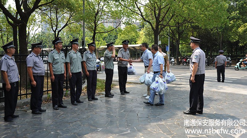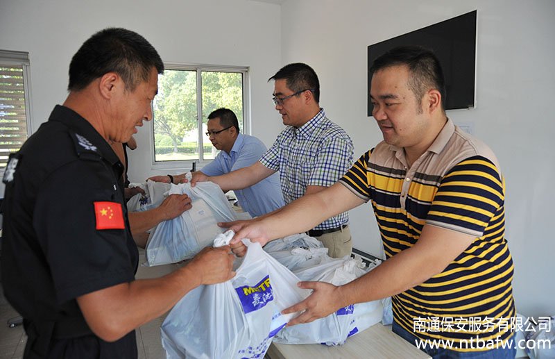 連日來,高溫持續(xù)。對于堅守在一線崗位的保安隊員,牽動著公司領(lǐng)導(dǎo)的心。7月25日,公司總經(jīng)理方俊、總經(jīng)理助理袁杰、工會副主席陸益輝慰問了行政中心、華能電廠、默克公司等駐點(diǎn)保安隊員,送上防暑降溫用品,并仔細(xì)詢問隊員的作息時間和工作情況,囑咐隊員做好防暑降溫工作。